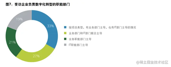 本次问卷调查中,仅有19%的受访企业数字化转型由IT部门主导,而由业务部门和IT部门联合主导的情况占到了27%,业务部门单独主导占21%(图表7)。这表明数字化转型不再仅仅局限于技术实施和运作,而是走到了和业务与管理深度结合,对内提高管理效率,对外挖掘新价值的阶段。