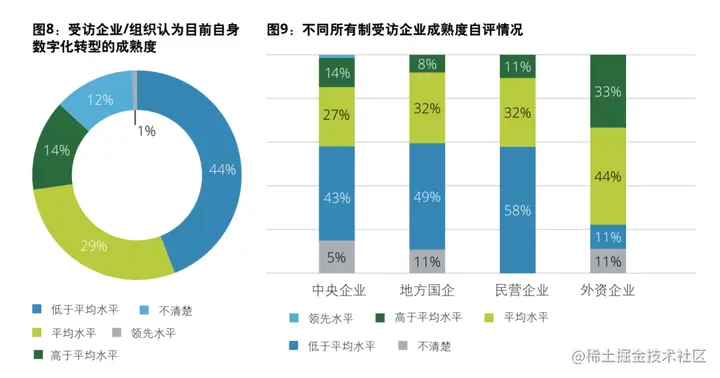 整体来看,多数中国企业已经启动数字化转型且进程在加快,但自评普遍不高;业务和职能部门逐渐主导和深度参与转型;提升管理效率与降本仍是绝大部分企业数字化转型目标;数据基础设施问题仍然是当前转型主要挑战。