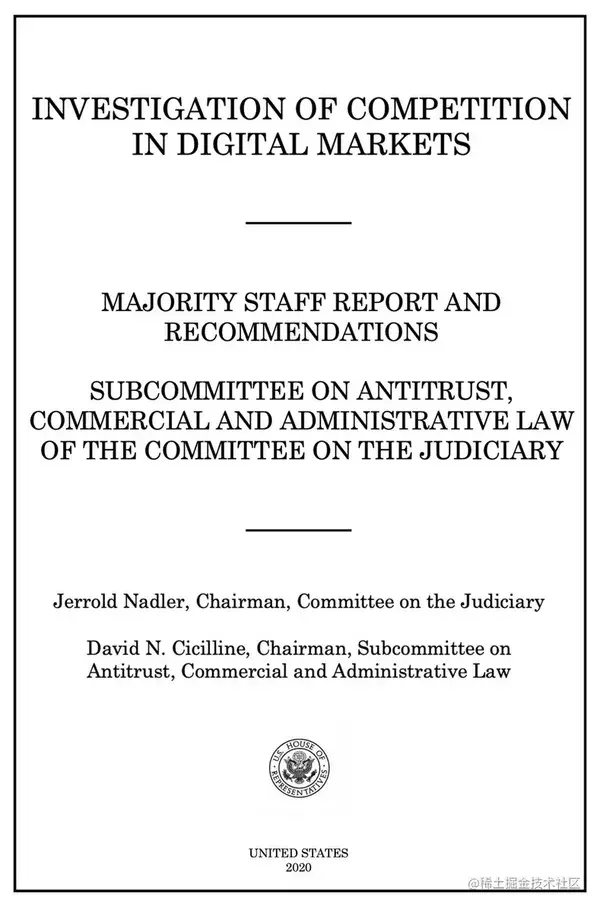 周二,美国众议院司法委员会发布了一份关于亚马逊、Facebook、苹果和谷歌这四大科技公司是否违反反垄断法的调查报告。这份报告是众议院司法委员会下属的反垄断小组委员会进行的为期16个月的调查结果。报告篇幅长达449页,详细介绍了每家公司的垄断和反竞争行为。报告中,众议院立法者表示,亚马逊、苹果、Facebook和谷歌正在利用其主导地位消灭竞争、扼杀创新,行使并滥用它们的垄断权力,由此呼吁对反垄断法进行半个世纪以来最彻底的修改。