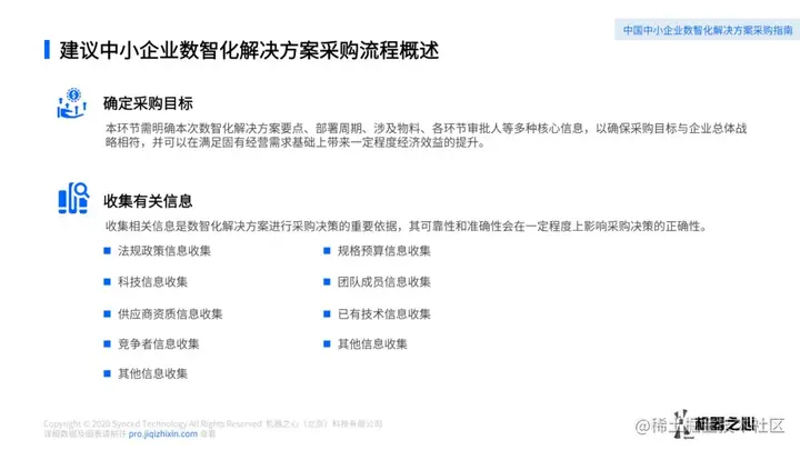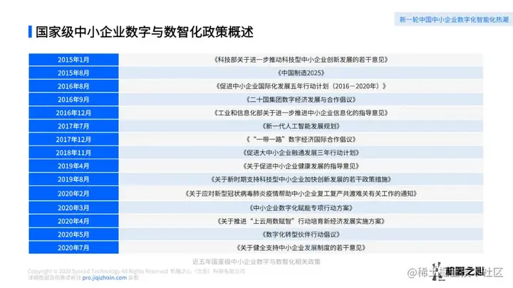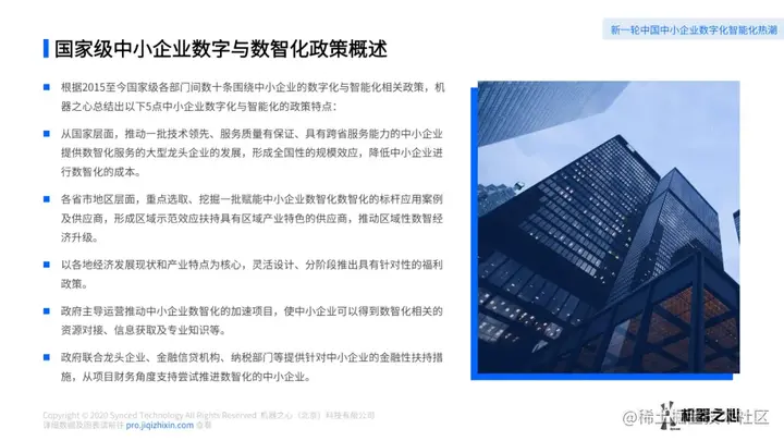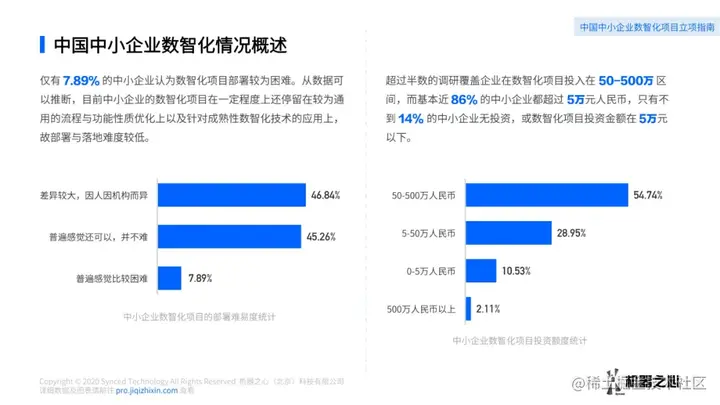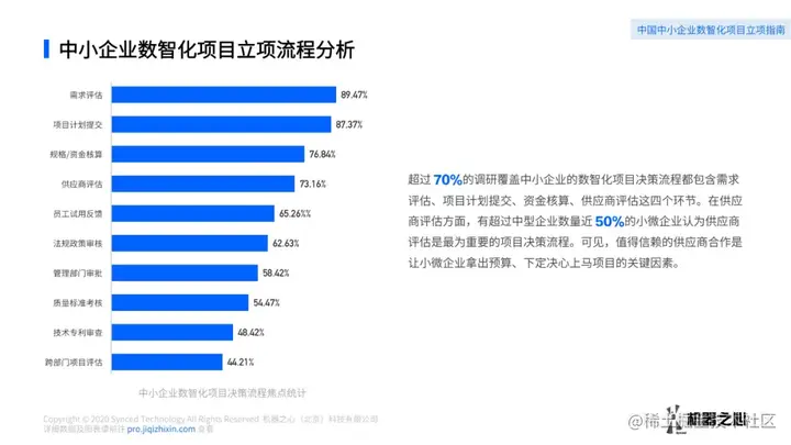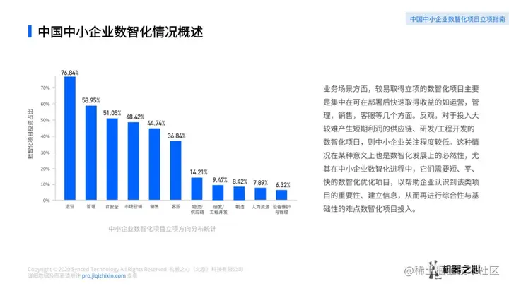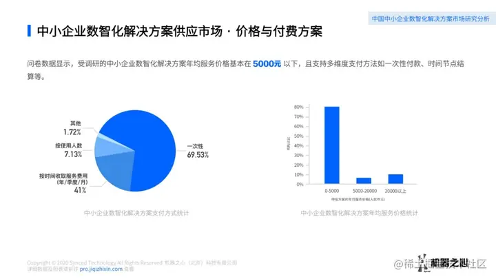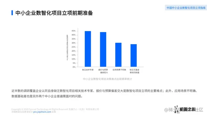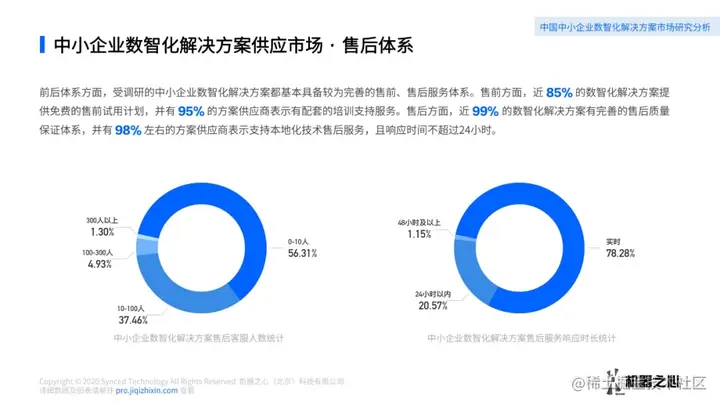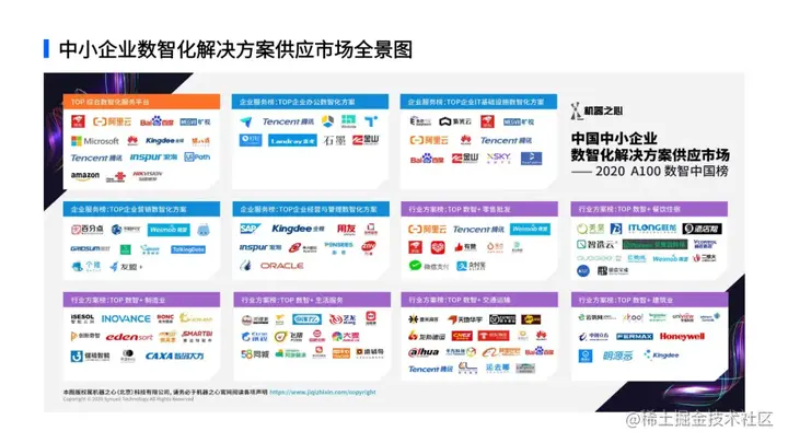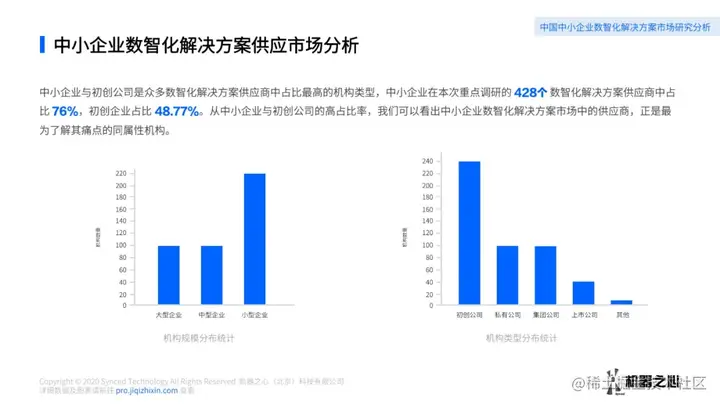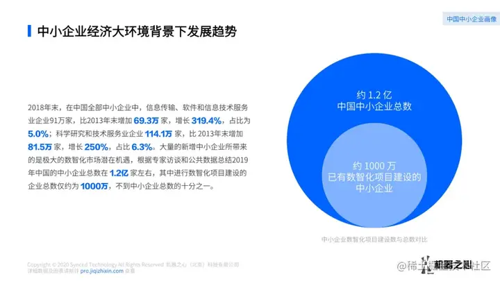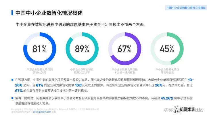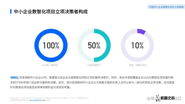 为此机器之心调研近千家中小微企业数智化服务商,试图理解中小微企业是如何衡量、决策,并选择适合自身的数智化方案。机器之心结合调研结果特发布《中国中小企业数智化解决方案供应市场研究报告2020》报告,供中小企业及其相关从业者从数智化政策、市场环境、项目立项、以及采购等多维度进行决策参考,供服务中小企业的数智化方案供应商进一步理解客户。