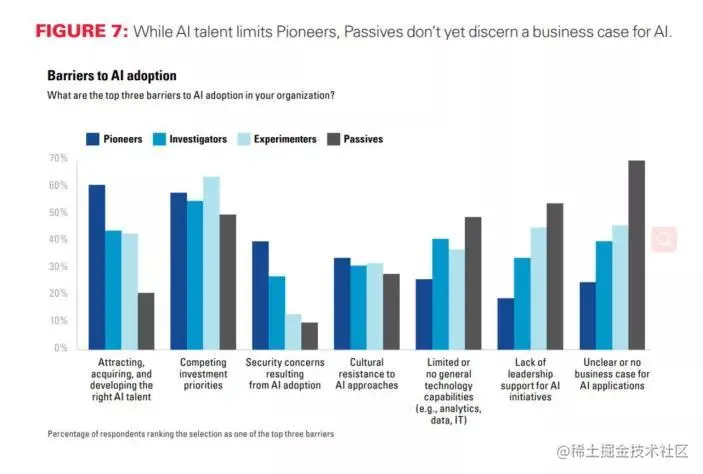 受访者被要求选出将AI应用于自己公司时遇到障碍,上图显示了7种制约因素对这4类企业的影响情况。