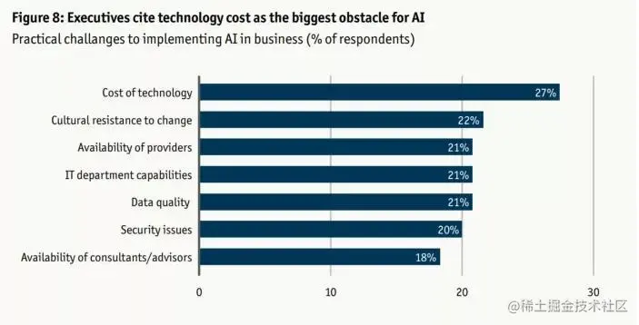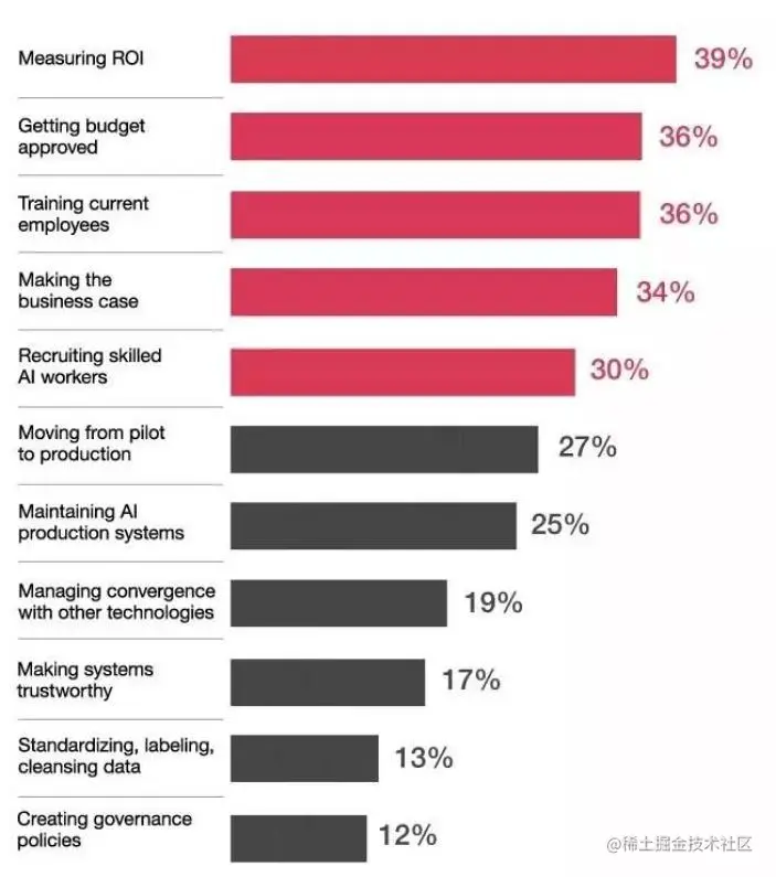 报告也分析了几个主要挑战,包括成本、数据质量和文化阻力。这些均在后来的实践中得到验证,直到现在也是影响AI落地效果的主要因素。