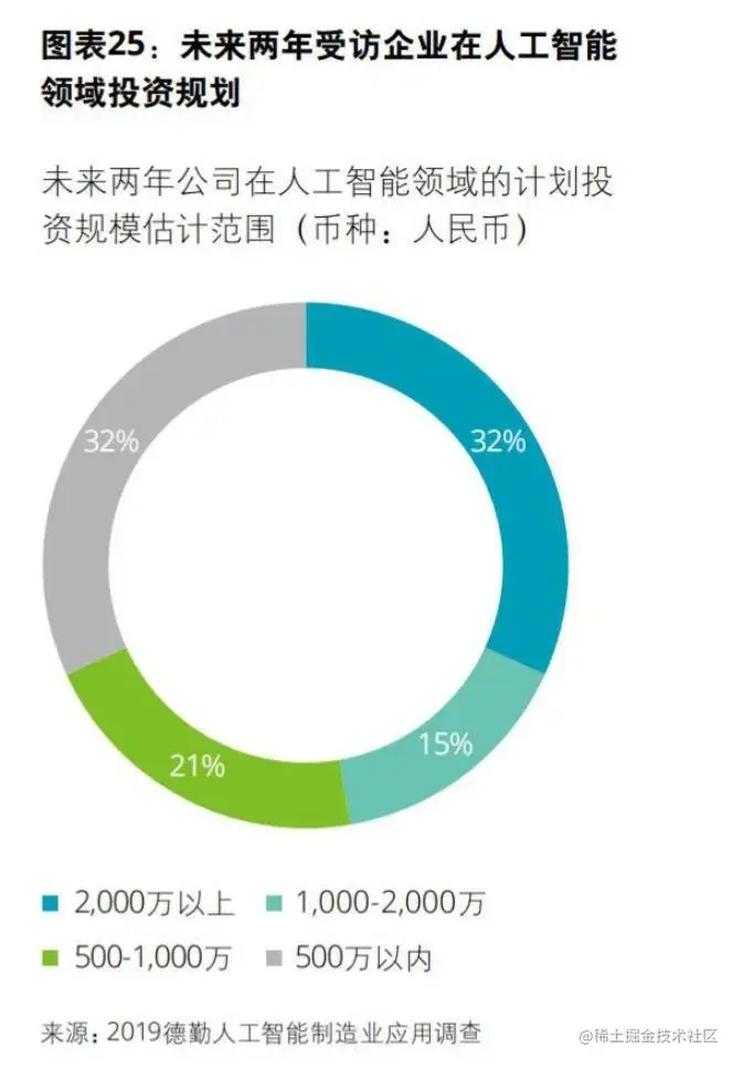 上述2018年麦肯锡报告数据显示,仅有21%受访者表示,到目前为止,对AI投资仅占公司总体数字技术支出的一小部分。 大多数受访者(58%)说,公司数字预算中只有不到十分之一用于AI ,尽管受访者绝大多数都认为未来几年AI投资将会增加(71%的人如此)
