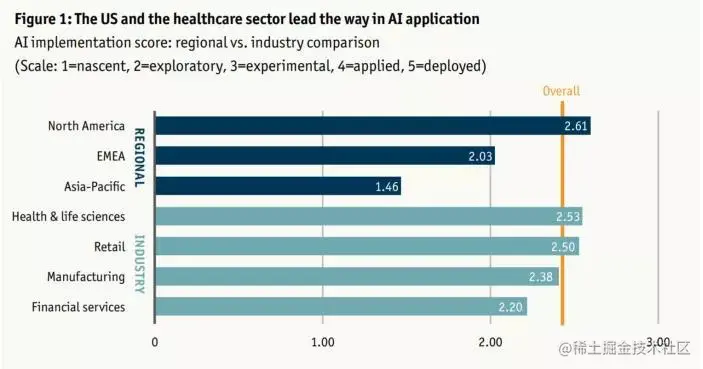 结果发现,特别是在北美(AI技术策源地和巨头互联网公司集中地),健康与生命科学、零售、制造和金融服务领域企业正在积极试水。