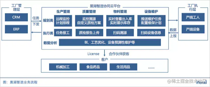 产品是通用的,但黑湖仅全面覆盖生产屋檐下发生的所有活动。诸如设备控制、机器硬件、IT并联传感器等底层部分,以及财务、人力绩效等顶层设计都留给生态伙伴。