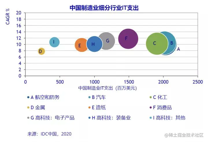IDC数据显示航天航空与防务、汽车、化工是制造业细分行业中IT支出的前三大行业。消费品制造支出同样可观,规模仅次于前三大行业。
