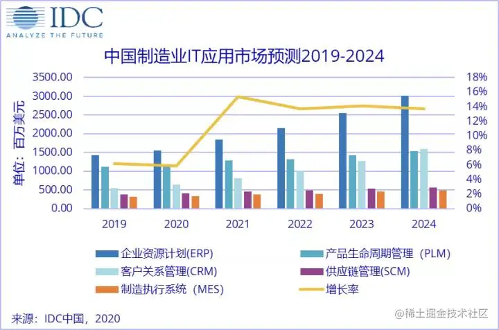 IDC的一份数据显示,2019年,通用类ERP、 PLM和CRM是中国制造业IT应用市场前三大投资领域,MES市场整体体量较小, 5年复合增长率为8.4。很明显,目前制造业ICT市场更侧重于IT投资,而车间层面的OT投资还需进一步提高。