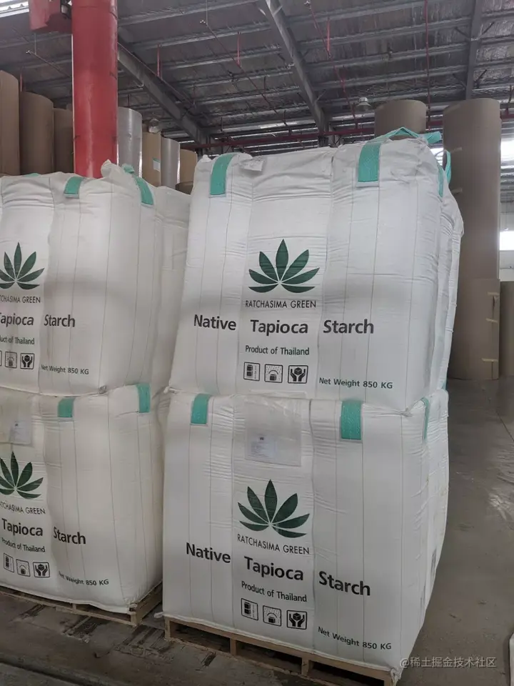 除了原纸,产线边还堆放着粘合剂的原材料淀粉。
