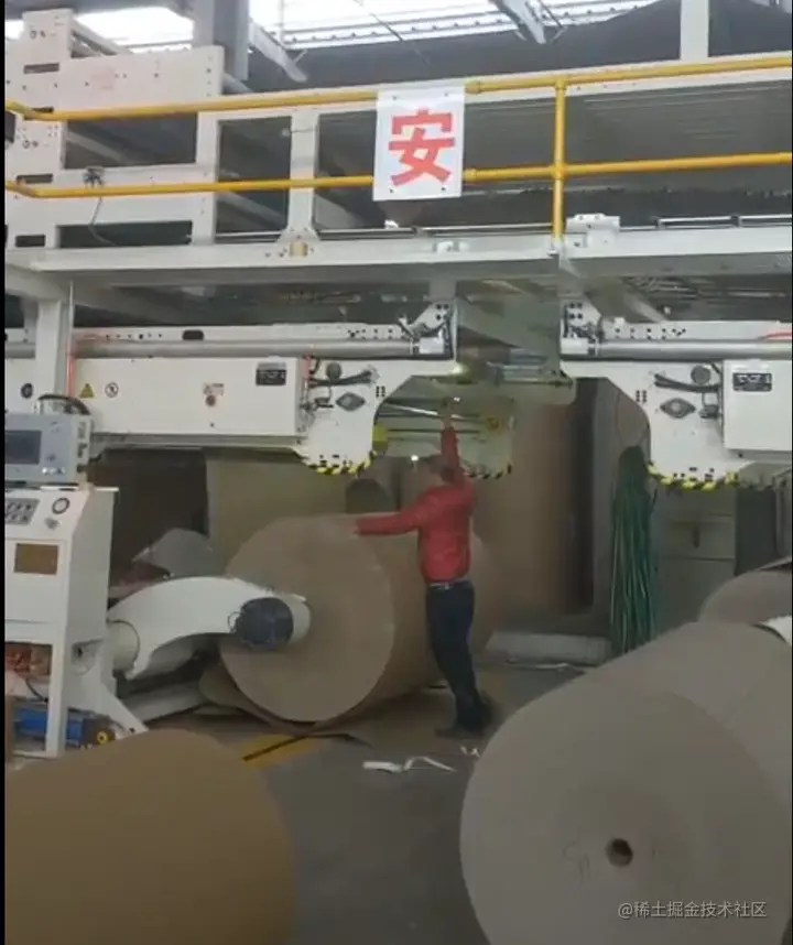 巨大无比的原纸经由地面轨道,自动安装到原纸支架上。