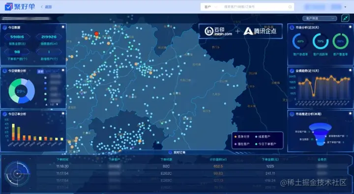 虽然这张浙江地图并不能提供更多商业情报,另一张墙上的可视化仪表盘却可以清楚呈现工厂周边有多少家客户及其市场画像。这正是腾讯企点与云印合作推出的SaaS「聚好单」的部分功能,主要服务丰收包装这样的二级厂(纸板厂)。