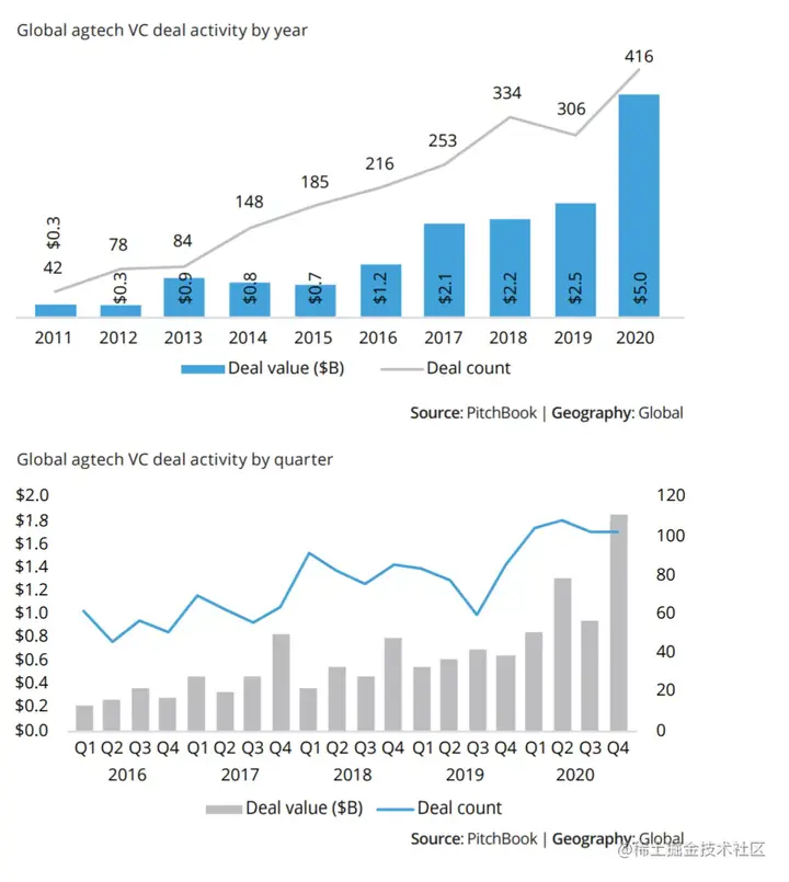 2020年,农业技术领域的公开投资总额为50亿美元。这一数字是2019年公开投资总额的两倍