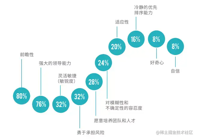 调研样本认为,前瞻性、强大领导力和灵活敏捷、勇于承担风险是被访企业认为数字化转型领军人物需要具备的主要特征。