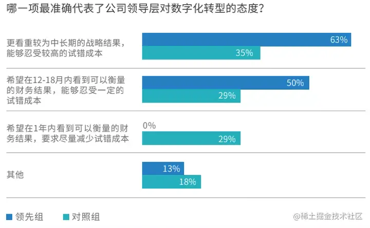 调研发现,在数字化转型领先企业中,有63%的企业表现出较高的试错容忍度,超过50%的企业愿意在1年以上的时间尺度上评估数字化转型的成效。并且没有一家企业要求在1年之内看到可衡量的财务结果。