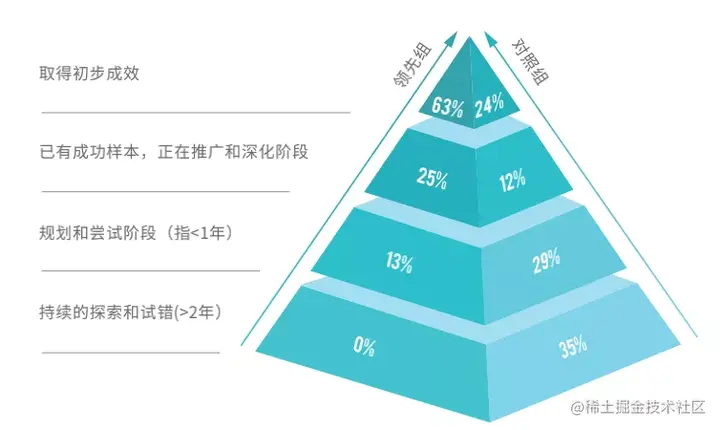 值得注意的是,领先组中,没有企业处于2年以上的探索和试错阶段,而对照组这一比例高达35%。报告认为,成功的数字化转型需要有较清晰、系统的战略规划,并进行有效的实施推动。