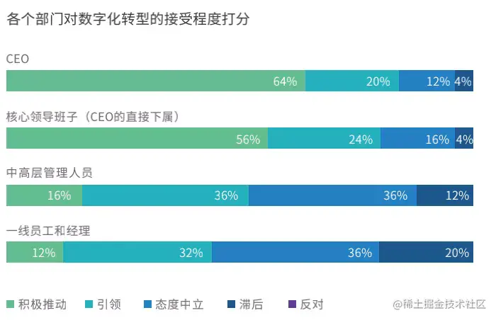 除了一把手的四大特质尤为重要之外,调研还有一个重要发现是,企业中层对数字化的接受和参与程度,也是影响企业数字化转型成功的重要因素。