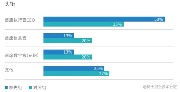 调研结果显示,在数字化转型领先组企业中,50%由CEO直接推动。而对照组企业仅有33%由CEO推动。报告认为,数字化转型是企业“一把手工程”,需要推动者具有全局意识和战略高度,因此数字化转型由CEO直接推动更容易产生成效。