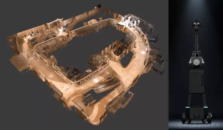 [左] Aibee对某购物中心局部3D重建图;[右]Aibee自研的8K全景地图机器人