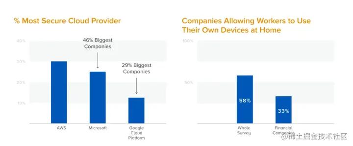 说到云安全,云配置管理是最重要的;只有33%的金融公司允许远程员工在家使用自己的设备,但大多数公司都允许远程员工在家使用自己的设备;数据安全是大多数公司最关心的问题,其次是基于角色的访问控制和治理、风险管理和合规。