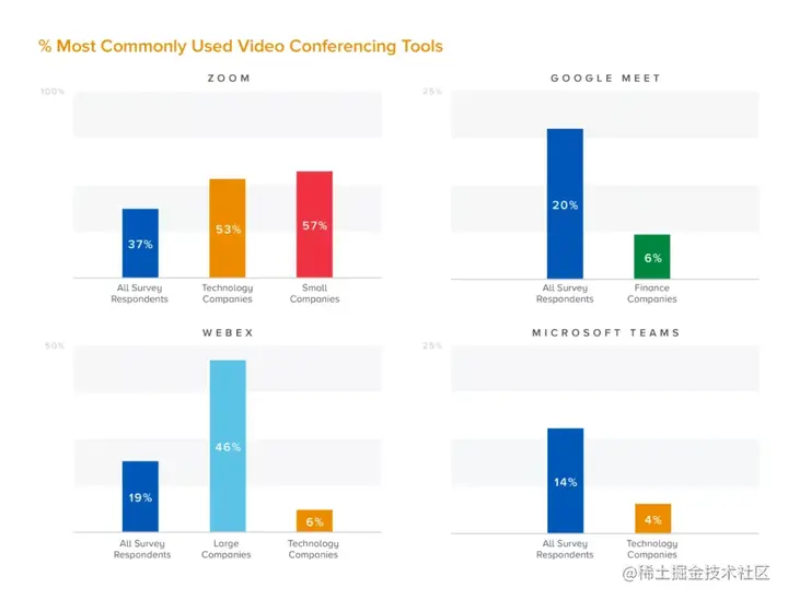 - 视频会议工具的选择差别很大,这取决于公司的规模和类型。小公司和科技公司倾向于使用Zoom和Google Meet,而大公司则强烈偏好WebEx。