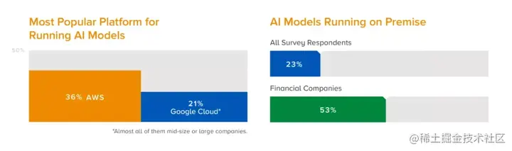 虽然AWS是运行人工智能模型最受欢迎的公共云平台,但53%的金融公司在本地运行人工智能模型,而在所有调查受访者中,这一比例为23%。