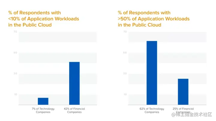 在云计算领域文化和代际趋势尤为明显,年轻的科技公司在向云计算进军方面遥遥领先。调查中,62%的科技公司受访者将超过一半的应用程序工作负载放在公共云上。相比之下,只有四分之一的金融公司在这种程度上使用云,42%的金融公司将不到10%的应用程序工作负载放在云上。