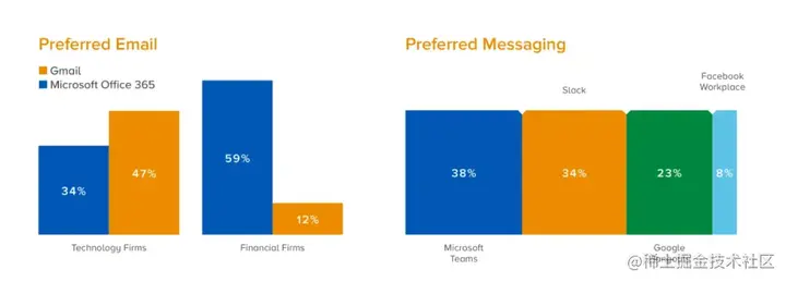 - 金融公司绝大多数依赖微软的电子邮件,而科技公司强烈首选Gmail。