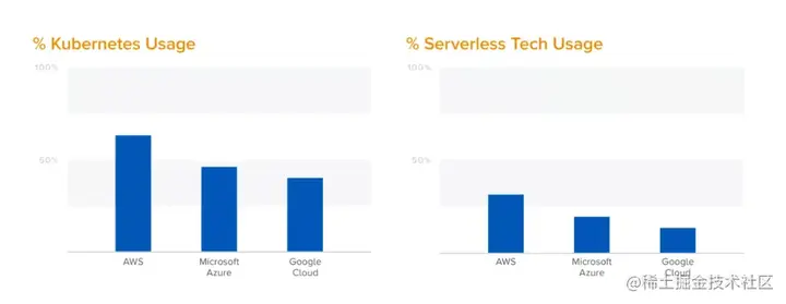- AWS在Kubernetes用户中最受欢迎,而且在无服务器技术方面也处于领先地位。