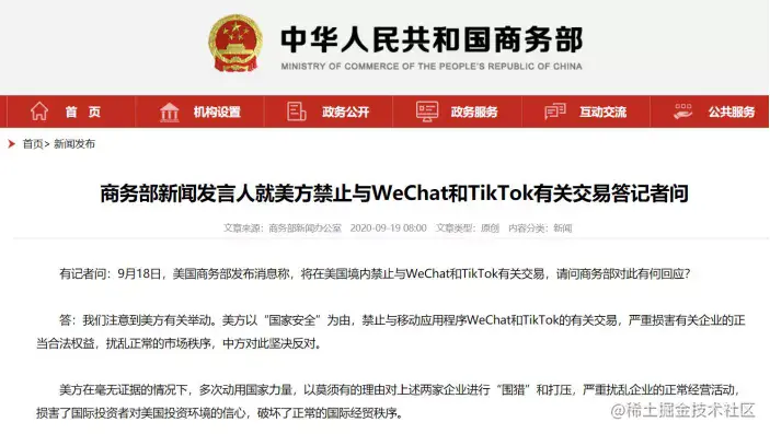 9月19日,中国商务部在回答记者提问的针对美国境内禁止与WeChat和TikTok有关交易作出了回应。