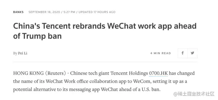 就在周日禁令前夕,据路透社报道称,腾讯将微信企业版应用程序由WeChat改为WeCom,欲在美国禁令生效之前将其设置为微信的潜在替代方案。