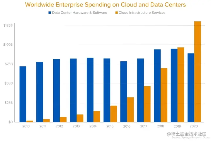 全球范围内企业在云和数据中心上的投入情况。蓝色为数据中心的支出(包括软硬件),橙色为云服务的投入情况。——译者注。