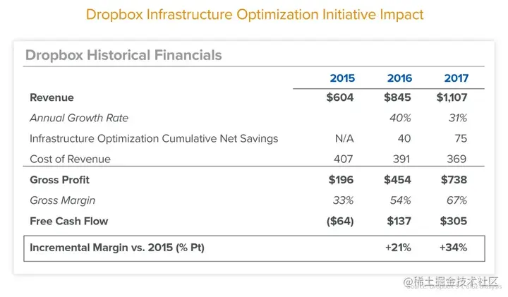 Dropbox在2016年启动其基础设施优化计划时,通过将大部分工作量从公共云转移到直接由Dropbox租赁和运营的「低成本定制基础设施」,他们在两年内节省了近7500万美元。毛利率从2015年的33%增长到了2017年的67%,他们指出,这「主要是由于我们的基础设施优化和营收的增加。」