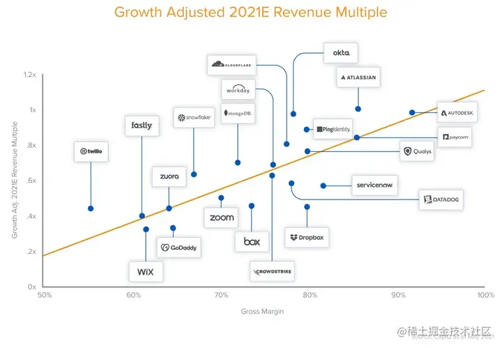 在我们分析的50家上市软件公司中,平均企业总市值相当于2021年毛利的倍数(基于上市时的CapIQ),也就是24-25X。换句话说:每节省1美元(或者说,毛利每增加1美元),市值会增长24-25倍。