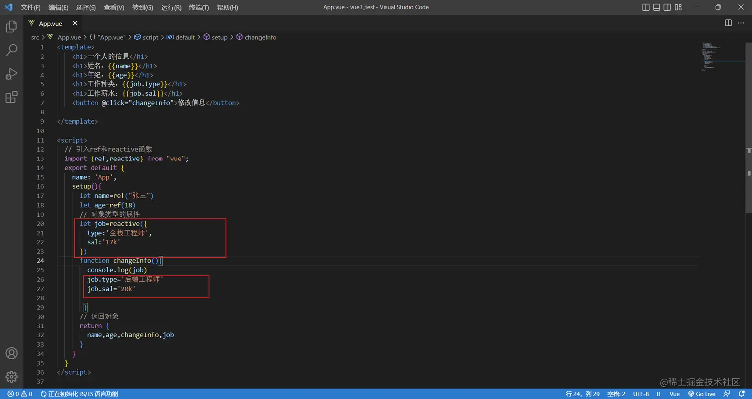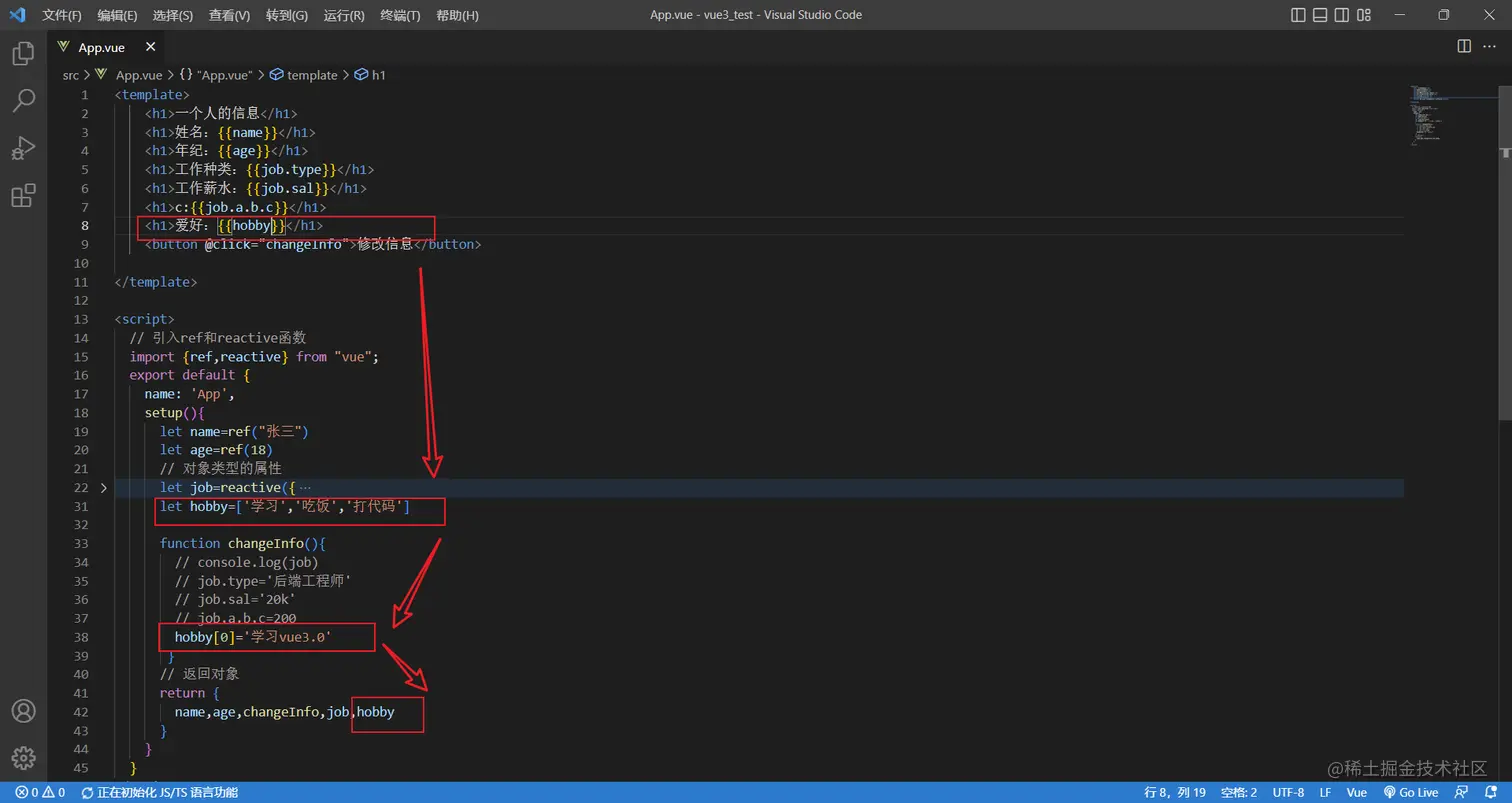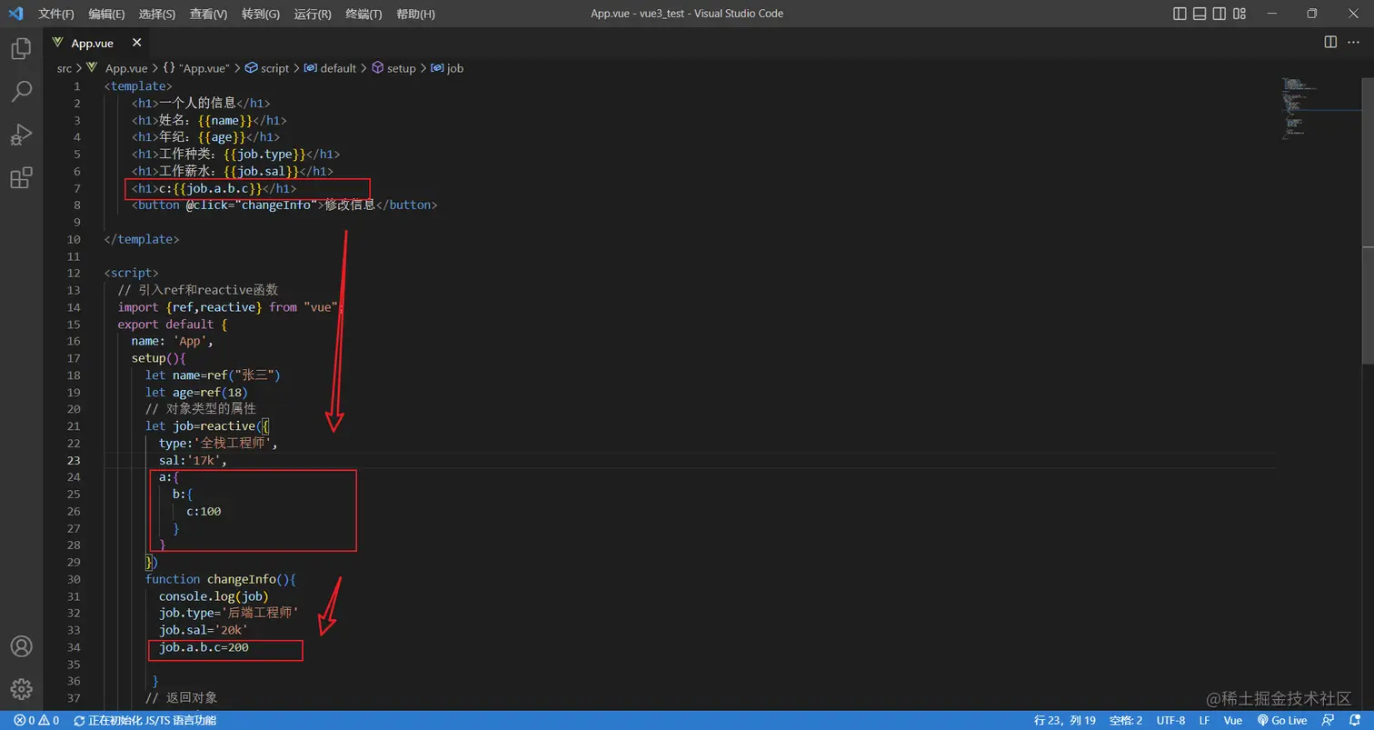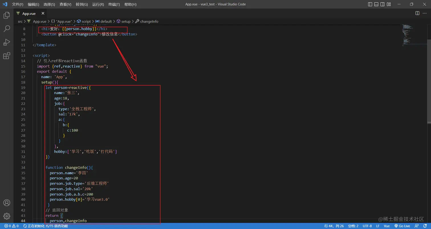 所以应该改成一个对象类型的数据,如果使用了reactive定义了,获取属性的时候直接获取即可,就不再使用.value了