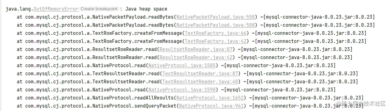 程序中的实例对象包括从数据库读取的数据是存在堆内存中的。所以这里的OutOfMemoryError是因为数据量过大超过了堆内存中设置的最大内存,一次性读取的数据太多导致内存容纳不下,抛出了内存异常