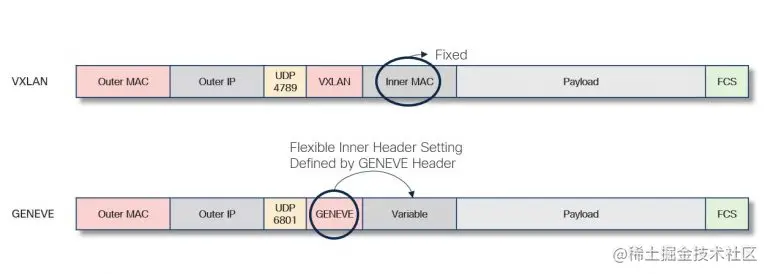 - 扩展性:NVGRE使用24位的TNI,相比之下,VXLAN只使用了8位的VNI,因此NVGRE支持更大数量的虚拟网络。