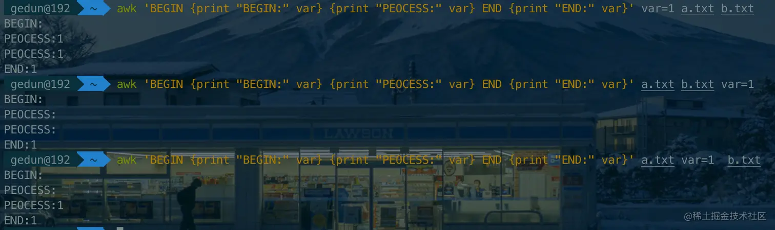 awk 'BEGIN {print "BEGIN:" var} {print "PEOCESS:" var} END {print "END:" var}' a.txt var=1 b.txt