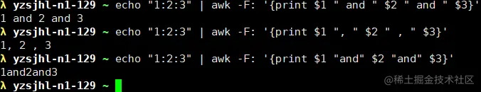 - 其中位置变量1,2...为前面输入的第几个字段,"$0"表示整个输入。