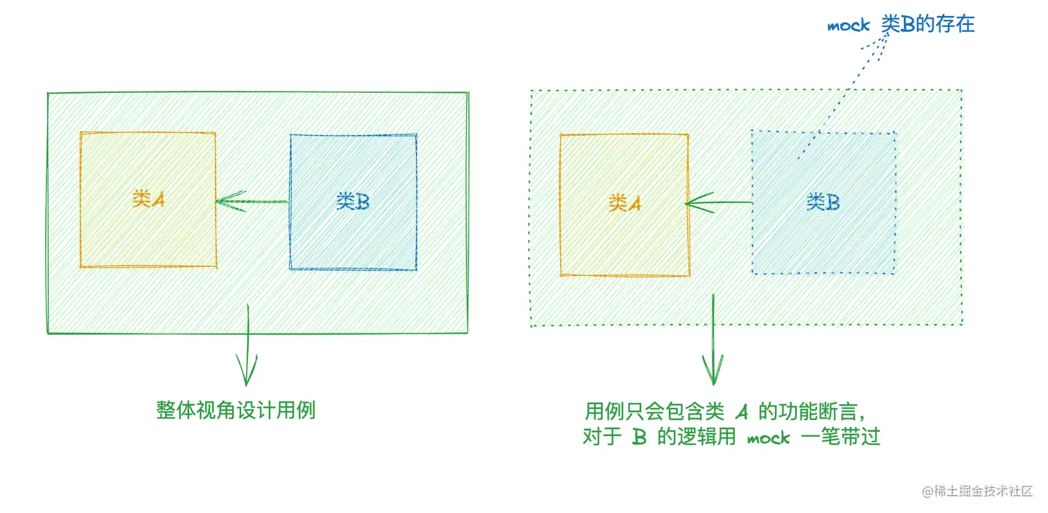 举个例子,例如 类 A 调用了 类 B,那么我们对类 A 的测试其实并不需要覆盖类 B 的逻辑,也就是说,类 B 功能是不是符合预期的在类 A 的用例中并不重要,我们只需要在类 A 的用例中保证涉及类 B 调用的部分存在且能有正常的值即可(这个保证也许是虚假不确定的)。