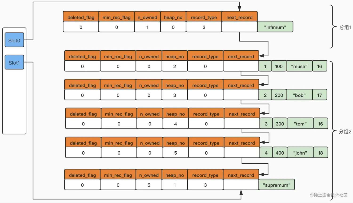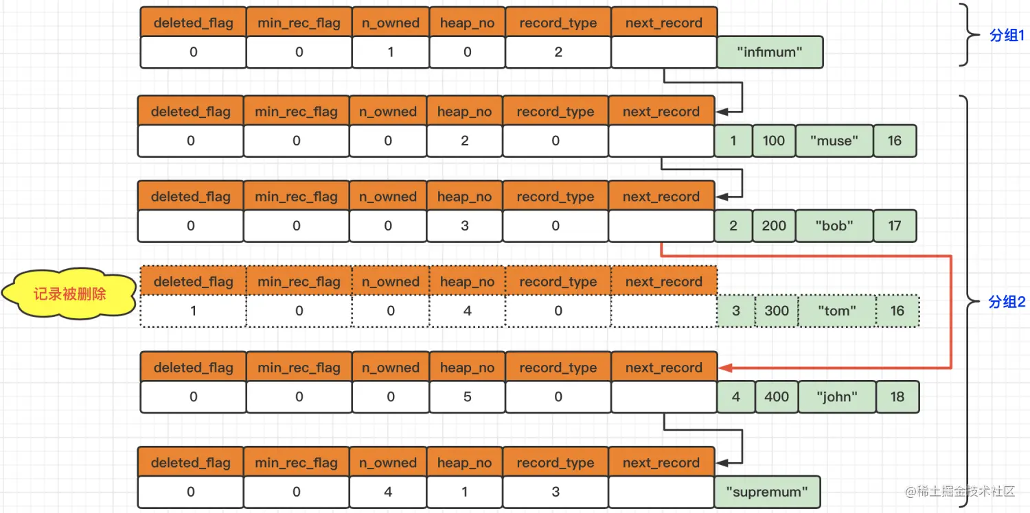 每个组的最后一条记录(即:也是这个组里,最大的那条记录)——“带头大哥”,其余的记录均为“组内小弟”;“大哥”记录的头信息中的n_owned属性表示该组内共有几条记录,而“小弟”的n_owned属性都为0;