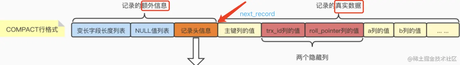 next_record:表示下一条记录的相对位置。就是链表。这个属性非常重要。它表示从当前记录的真实数据到下一条记录的真实数据的距离。如下所示:
