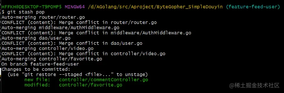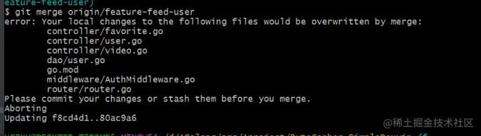 git stash本地刚才修改的代码将会被暂时封存起来 git merge origin/feature-feed-user重新合并