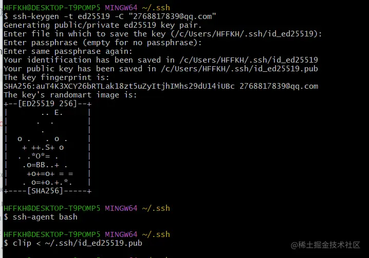 ssh-keygen -t ed25519 -C "2768817839@qq.com" - 执行