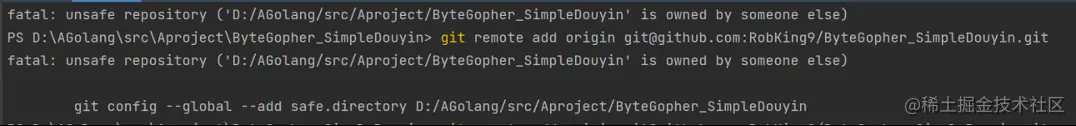 fatal: unsafe repository ('D:/AGolang/src/Aproject/ByteGopher_SimpleDouyin' is owned by someone else)