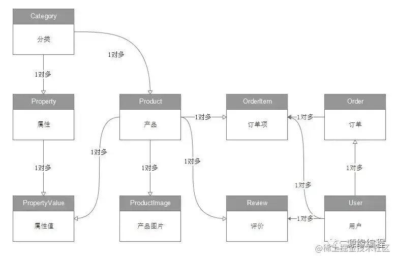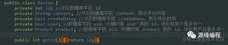 所谓的实体类,就是对于数据库中的表的互相映射的类。 这是一种 ORM 的设计思想,即一个对象,对应数据库里的一条记录 举个例子,对于 评价 / review 的 实体类 和 表结构 设计如下: