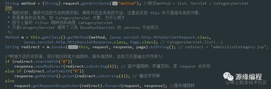 3.3 然后根据这个值,服务端跳转到 categoryServlet,并且把 x 这个值传递过去categoryServlet 继承了 BaseBackServlet,其 service 方法会被调用。在 service 中,借助反射技术,根据传递过来的值 x,调用对应 categoryServlet 中的方法 x()
