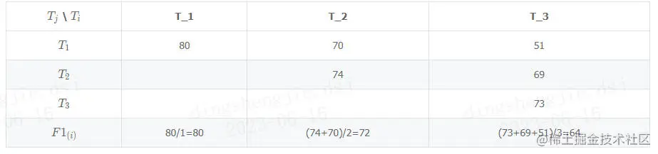 给定一个共有 3 个任务(N=3)的任务序列,对于顺序 “T1 - T2 - T3”, 指标计算的过程如下表所示,每个表项中的数值为模型学完任务 Ti(i 即提交示例中的 “current_task_id”)后在 Tj(1≤j≤i)(j 即提交示例中的 “test_task_id”)上的 F1 分数 F1i,j: