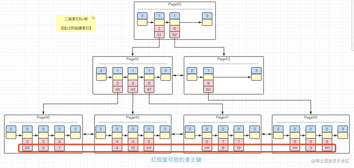 这个索引,是将c2列进行了排序。区别是,叶子节点存储的不是完整的用户记录,而只是c2列+主键列着两个列的值。