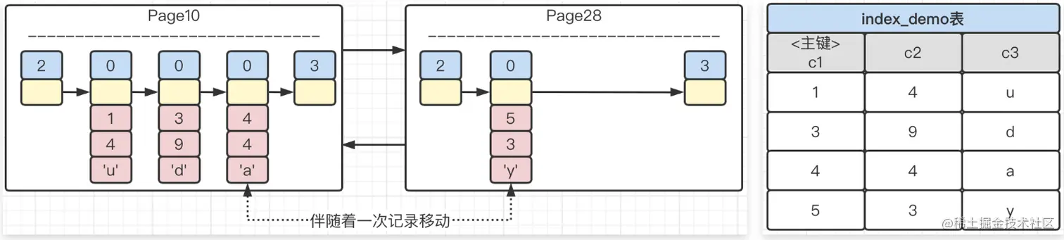 由于新插入的主键为4,小于5,所以,新数据会插入到Page10中,c1=5这条数据,会插入到新申请的页Page28中。这个过程也叫页分裂。