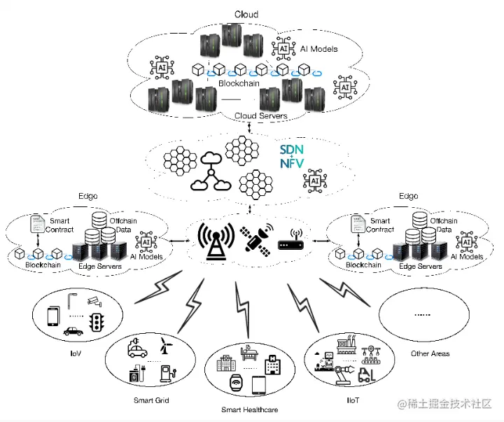 在体系结构的顶部是云,它用于处理一些边缘节点无法完成的高度复杂的任务。例如:一些具有高存储开销的原始数据(例如,医疗保健中的x射线图像)可以存储在云中,而它们的元数据则存储在区块链中。