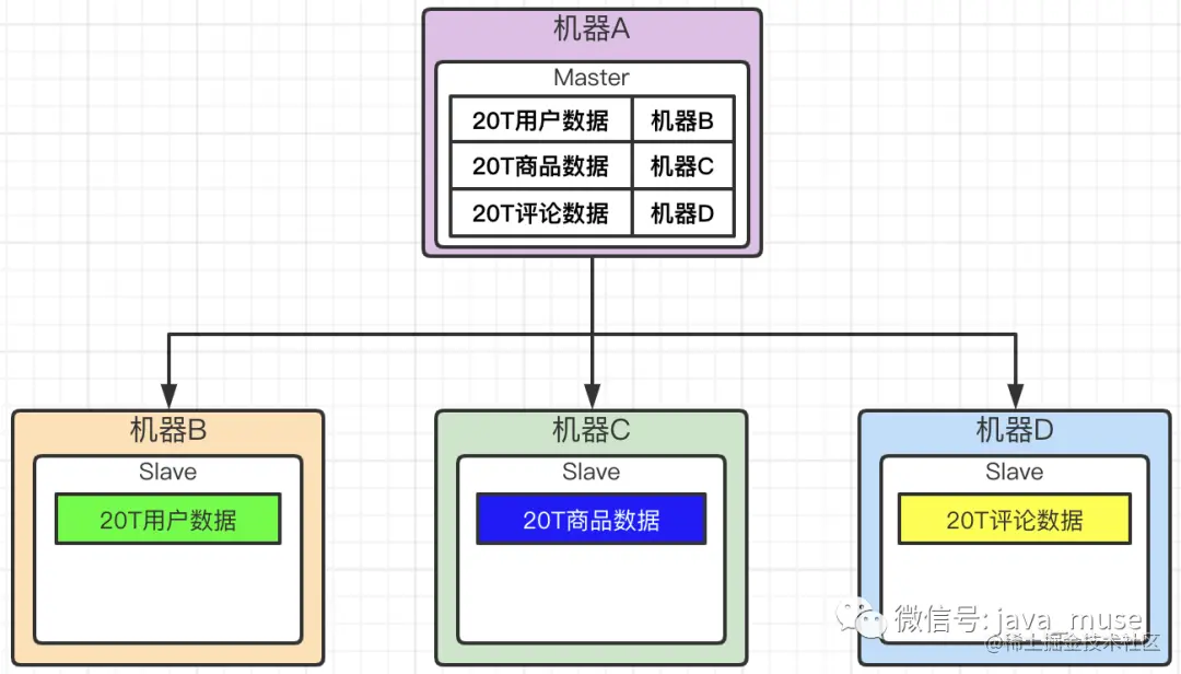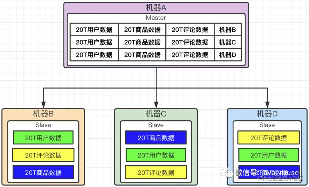 如果用户要获取商品数据,那么请求会发送到master节点,然后通过master找到机器C中是存储了20T的商品数据,那么请求发送到机器C,从机器C中查询用户所需要的数据,然后返回给用户。